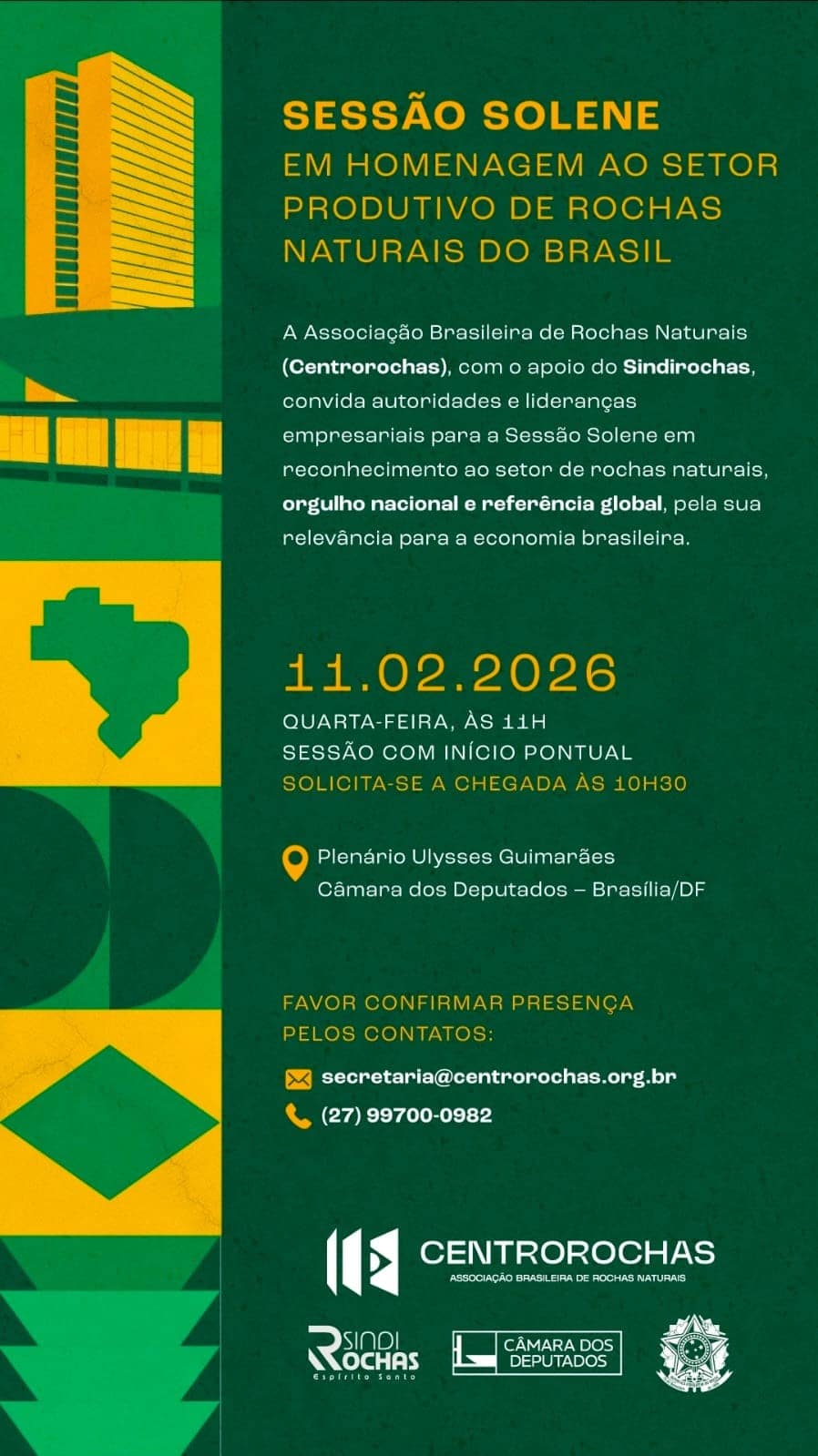 Empresários do setor de rochas naturais do Brasil serão homenageados em solenidade na Câmara dos Deputados, em Brasília. O evento será acontecerá no dia 11 de fevereiro, no Plenário Ulysses Guimarães.