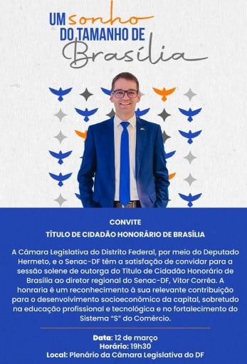 O diretor do Senac-DF, Vitor Corrêa, receberá o título de Cidadão Honorário de Brasília. A honraria será concedida pela Câmara Legislativa do Distrito Federal, por sugestão do deputado Hermeto. A entrega do título acontecerá nesta próxima quinta-feira (12) à noite.