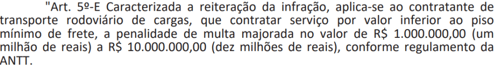 Em suma, a principal mudança na lei é parar quem contratar frete por valores abaixo da tabela, seja pessoa física ou empresa: A partir de hoje quem incorrer nisso pode pagar multa de R$ 1 milhão até R$ 10 milhões , dependendo do caso (distância percorrida, tipo de material etc).