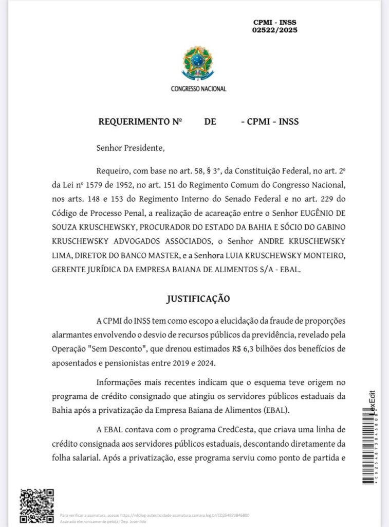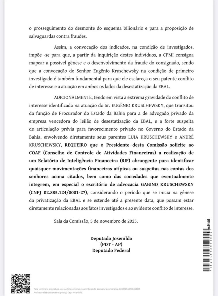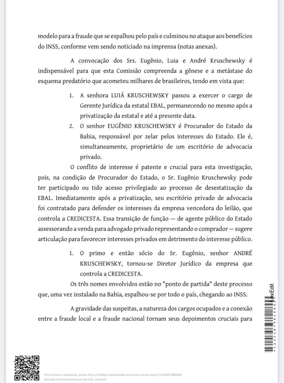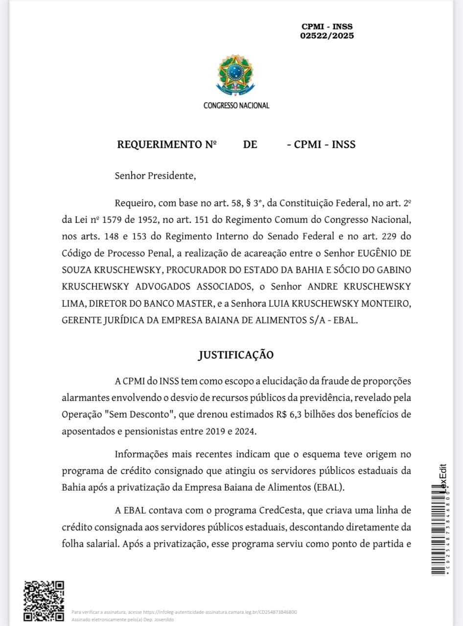 O advogado Eugênio Kruschewsky, de Salvador, entrou na mira da CPMI do INSS no Congresso Nacional, conforme a Coluna antecipou. Há requerimento de convocação feito pelo deputado Josenildo (PDT-AP) para se explicar na comissão que investiga a fraude no desconto dos aposentados.